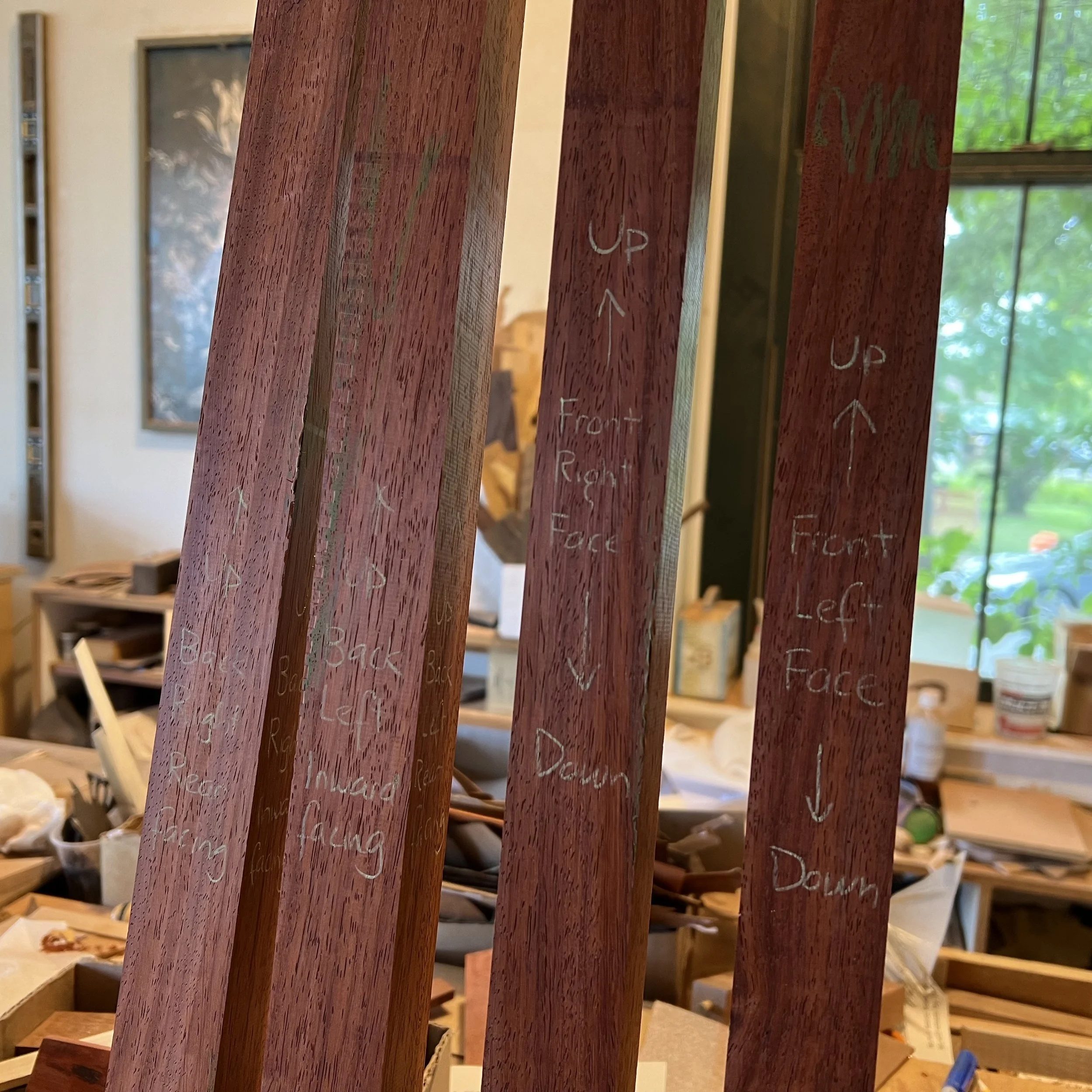 I hadn’t done anything with the legs of the cabinet for a few months, since I had rough cut them from my big board of padauk, but it was time to prepare them so that I could build the case of the cabinet.