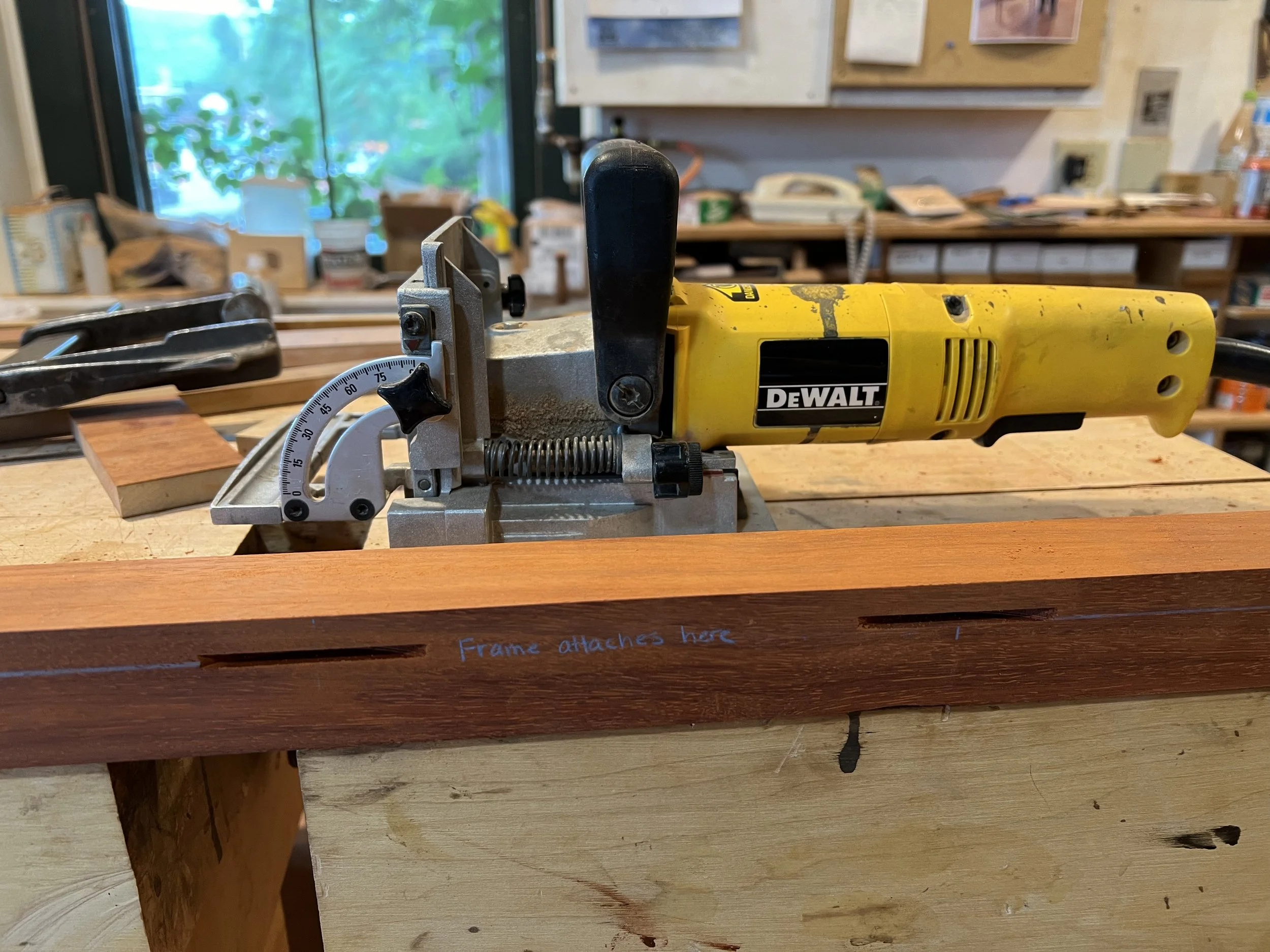 One of those steps was making biscuit holes. Biscuit holes are crescent-shaped slots made with a power tool called a biscuit joiner.