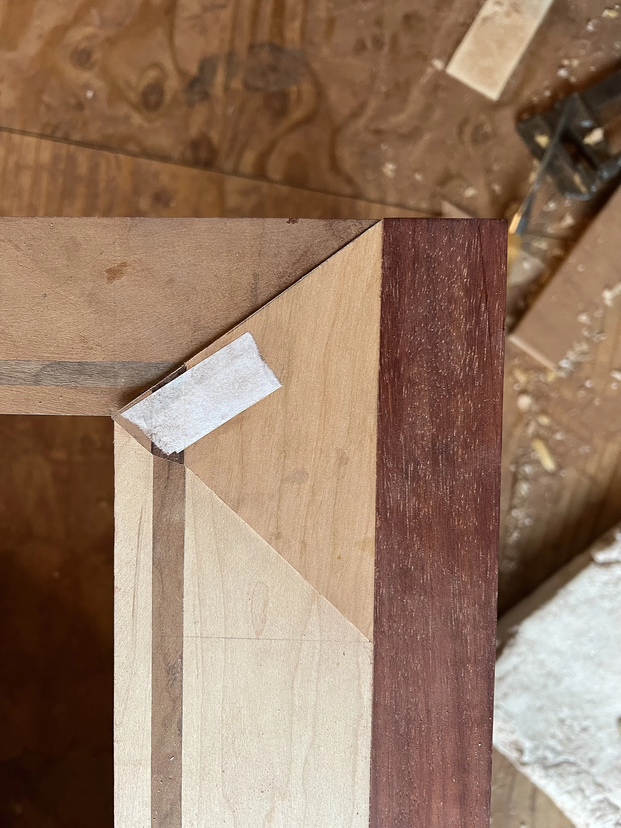 I made a marquetry shadow with cherry and walnut veneer to go into the corner that I had cut out.