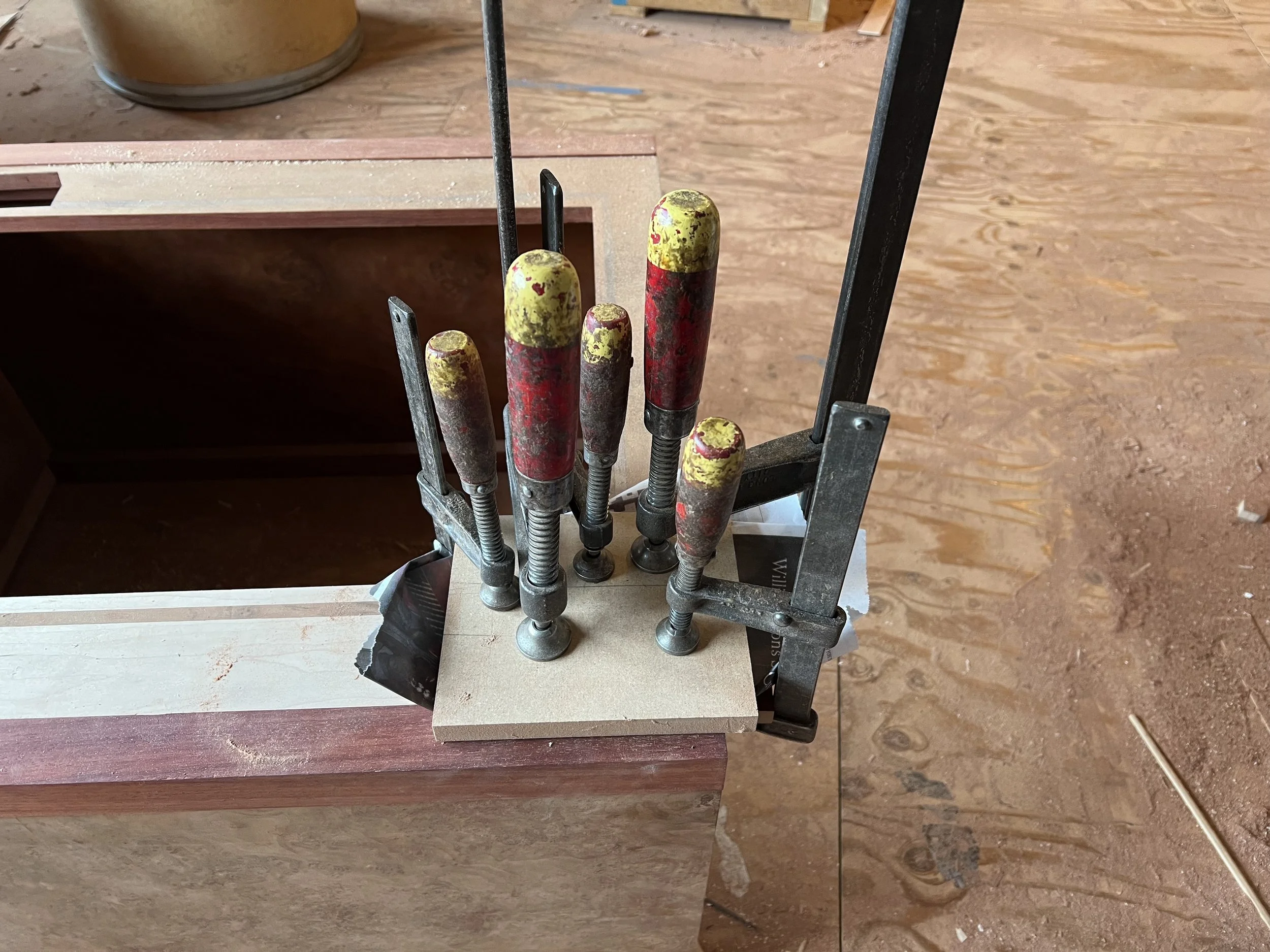 I used a router to take off some veneer in the corner, setting up fences with clamps and scrap wood so that the router would only go over the area that I wanted to remove.