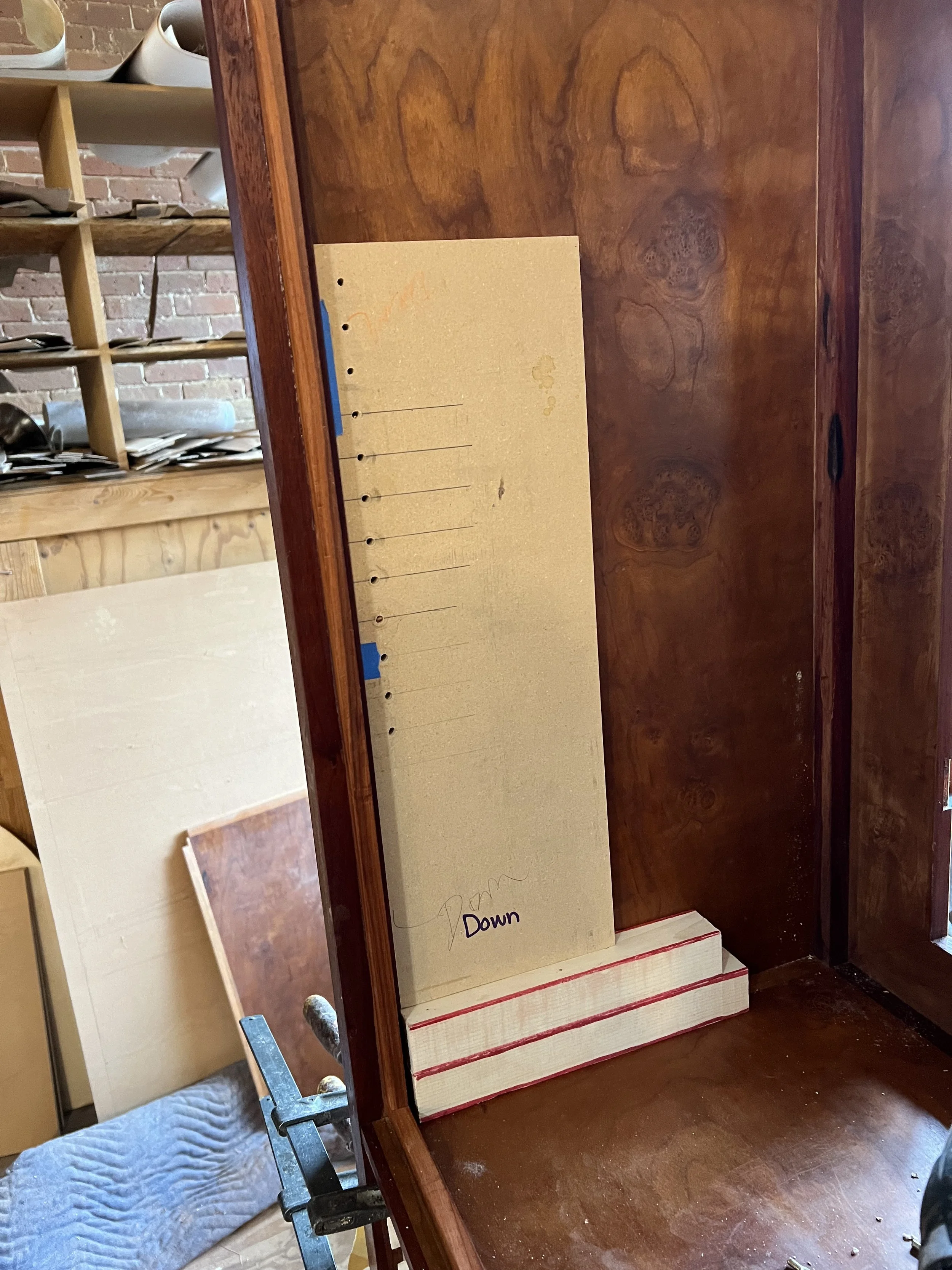 I had constructed two shelves to go on the inside of the main compartment, but I hadn’t installed them yet. I drilled holes in the sides for brass shelf pegs to hold the shelves in place. I used a shelf-hole template that was in the shop from a previous project to make sure that the holes were level with each other.