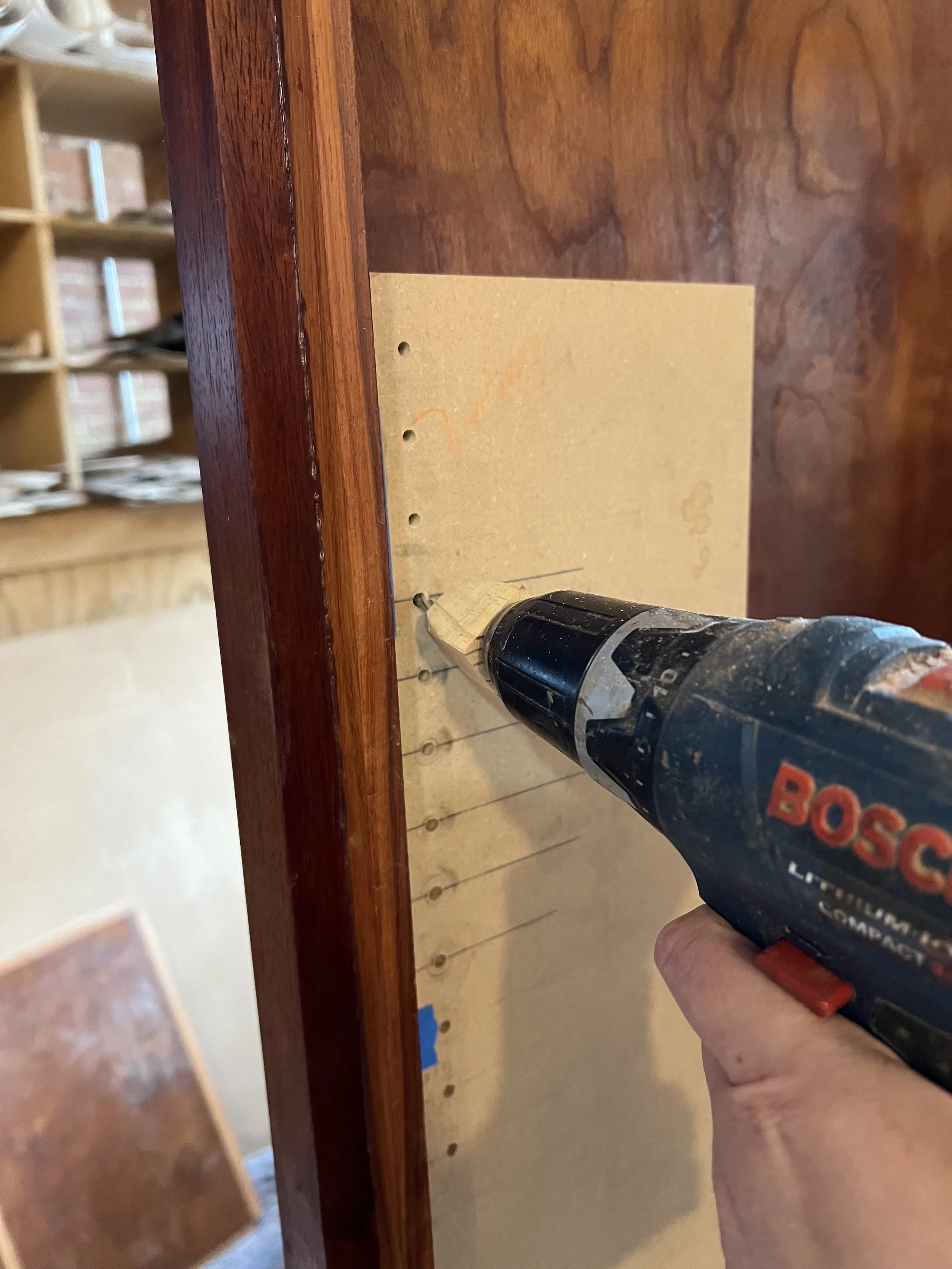 The placement of the bottom shelf was constrained by the placement of the door hardware, but the top shelf could be higher or lower, so I drilled multiple holes for the top shelf pegs.
